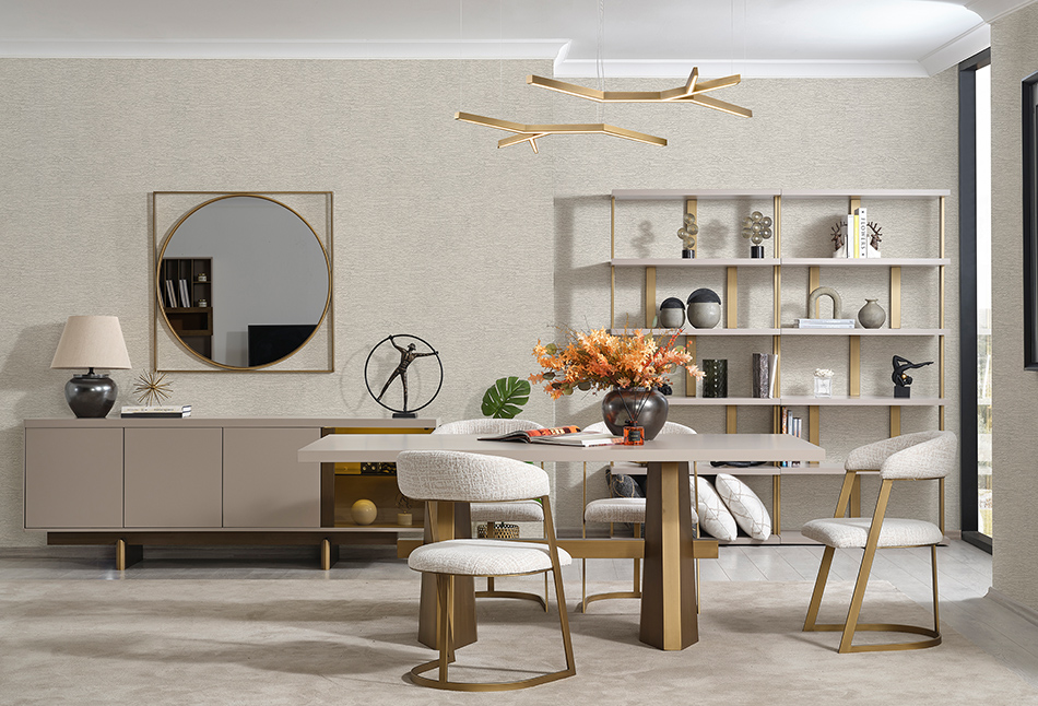 Stella Vizon Yemek Odası, sıcak ve modern bir atmosfer yaratmak için ideal bir seçenektir. Doğal vizon rengi ve zarif tasarımıyla dikkat çeken Stella Vizon mobilyaları, odanıza sıcaklık ve şıklık katarken, yüksek kaliteli malzemeler de uzun ömürlü kullanım sağlar. Ergonomik sandalyeler ve geniş masa, konforlu bir yemek deneyimi sunar. Stella Vizon Yemek Odası, evinize modern bir tarz ve lüks bir dokunuş getirir.